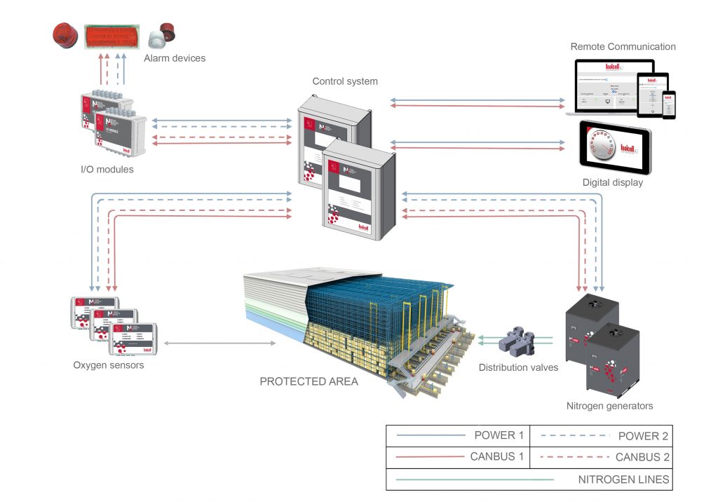 Data l’importanza della centrale di controllo nell’impianto di prevenzione incendi con metodologia a deplezione di ossigeno, essa è regolamentata da normative specifiche che impongono, oltre a una serie di caratteristiche di autodiagnosi e ridondanza, una doppia fonte di alimentazione per garantire il funzionamento dell’impianto per almeno 24 ore anche in assenza di alimentazione elettrica primaria.