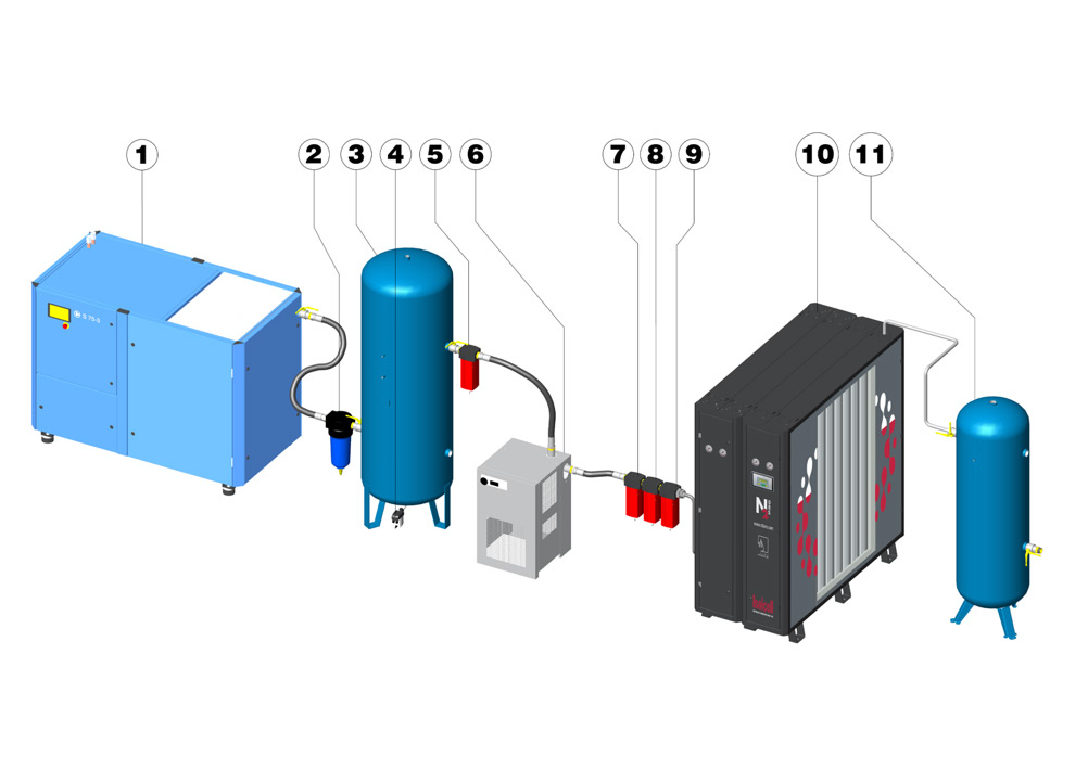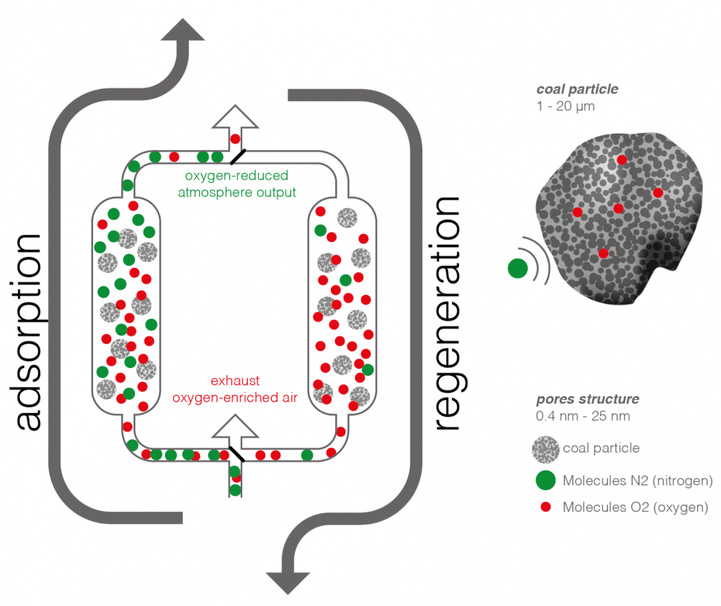 l generatori di azoto NIMOS a tecnologia PSA, basati sul principio della selezione molecolare, si avvalgono di particolari carboni attivi in grado di separare dall’azoto l’ossigeno presente nell’aria. Un flusso di aria compressa, preventivamente essiccata e filtrata, alimenta le colonne contenenti i setacci che filtrano l’aria all’interno del generatore PSA. La fase di separazione avviene in pressione (da 6 a 10 bar); mentre una colonna viene rigenerata per eliminare l’ossigeno trattenuto, un’altra provvede alla separazione trattenendo le molecole di ossigeno e lasciando passare quelle di azoto. Il ciclo si ripete con continuità, realizzando un’erogazione continua e costante. I generatori NIMOS sono completamente automatizzati; sono inoltre dotati di un analizzatore di ossigeno e di un microprocessore che ne controlla il funzionamento.