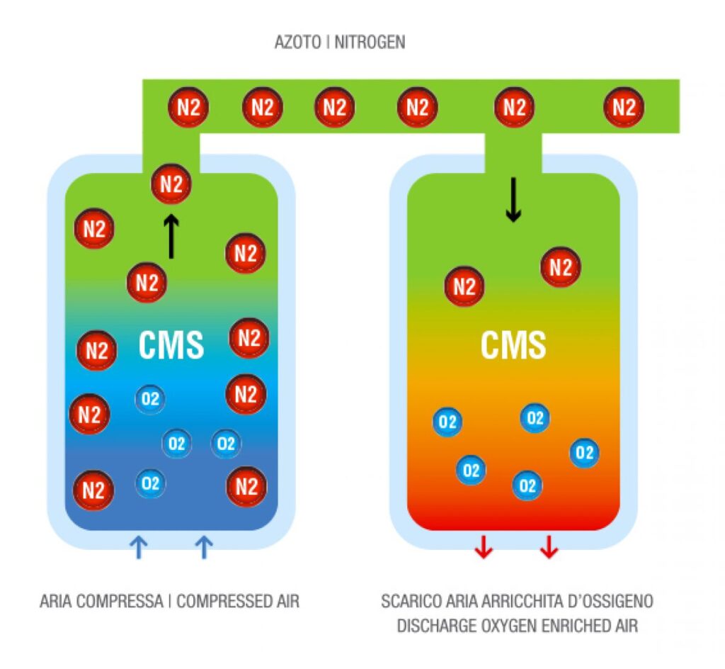 I nuovi Generatori d’azoto Serie M-S-D sono l’ultima evoluzione dei tradizionali sistemi PSA (pressure swing adsorber) che permettono di produrre Azoto in continuo dall’aria compressa. I Generatori d’azoto Serie M-S-D sono costituiti da uno o più moduli di due colonne riempite di setacci molecolari di alta qualità caratterizzati da una porosità molto fine e quindi ad altissime prestazioni e selettività. L’aria compressa, essiccata e filtrata, attraversa una delle due colonne filtranti che ne trattengono ossigeno, residui di vapore acqueo ed di altri gas rari. Quando la colonna filtrante si è saturata di ossigeno, viene depressurizzata scaricando l’ossigeno nell’aria. Nello stesso momento l’aria compressa viene deviata nell’altra colonna, cedendo l’ossigeno fino al cambio successivo. Questo ciclo continuerà ininterrotto da prima per riempire un serbatoio di accumulo, che funge da polmone per assorbire eventuali picchi di richiesta e poi per garantire l’ erogazione continua di azoto al processo. Quando il serbatoio di accumulo raggiunge la massima pressione di riempimento il Generatore si pone automaticamente nella posizione di stand-by, in attesa di nuova richiesta di gas.